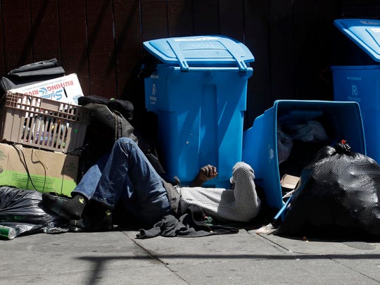 A homeless man sleeps in front of recycling bins and garbage on a street corner in San Francisco. (Photo: Jeff Chiu/AP)